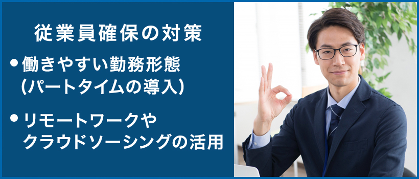 例えば、パートタイムの導入を行えば、定年退職や子育て中などのフルタイムでの勤務が難しい方も雇用できます。