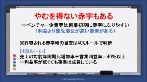 40%ルールとは「売上の対前年同期比増加率+営業利益率=40%以上」が成り立つかどうかの考え方です。この値が40%を超えていれば、営業利益率が低くても事業が成長していると捉えられます。