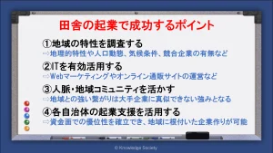 田舎の起業で成功するには、個々の地域の特性を調査し、事業計画に落とし込むことが重要です。