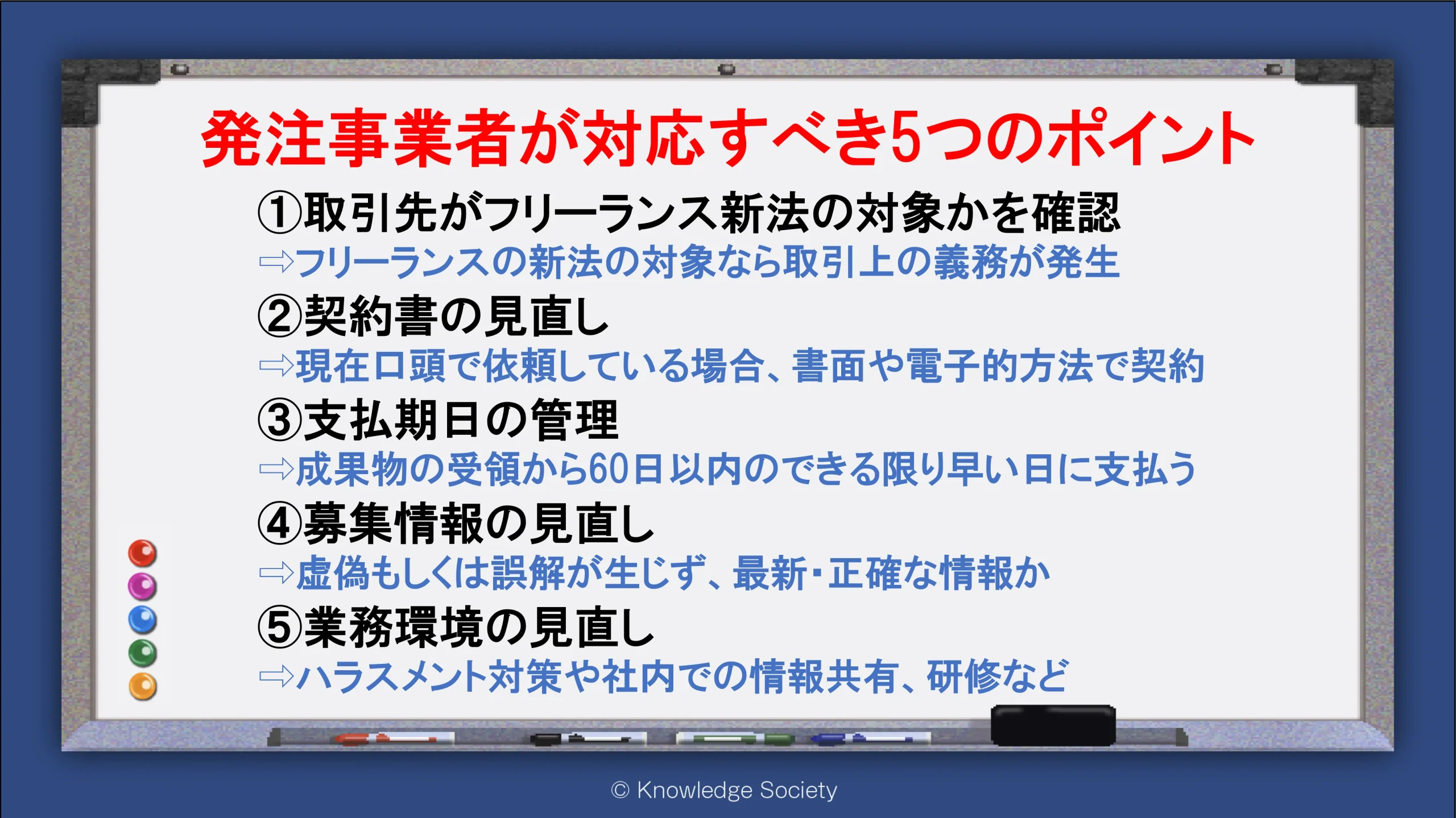 シェアオフィス・バーチャルオフィス@東京都千代田区|ナレッジソサエティ > 起業ノウハウ > フリーランス新法とは?概要や事業者の対応・義務をわかりやすく解説【2024年11月施行】 > 発注事業者が対応すべき5つのポイント