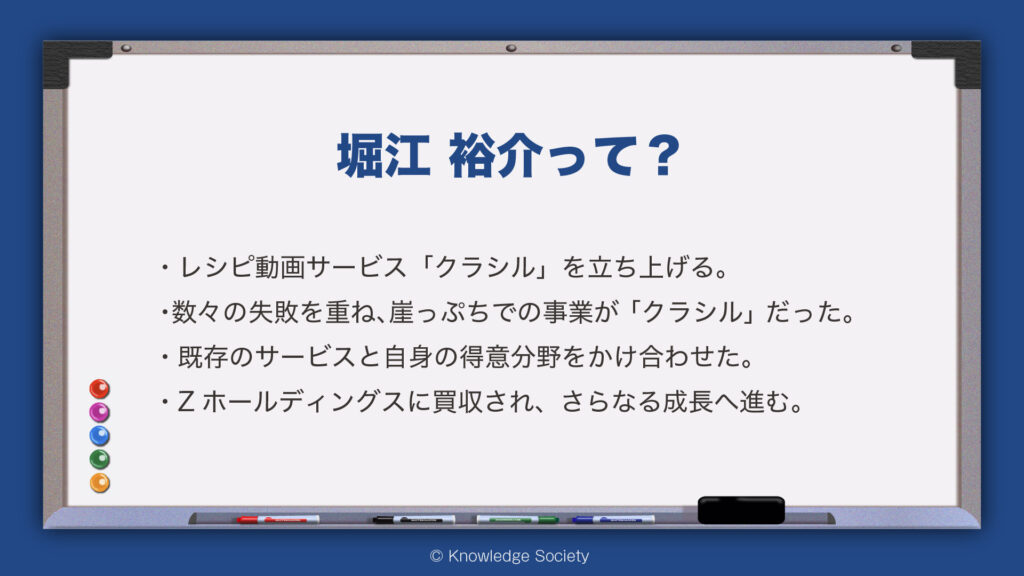 今回は、レシピ動画サービス「クラシル」を運営するdelyの創業者の堀江裕介氏について取り上げたいと思います。学生、特に大学生の皆さんは一度は耳にしたとがあるのではないでしょうか。短い動画で料理のレシピを紹介するクラシルは、どのような発想から生まれたサービスだったのしょうか。