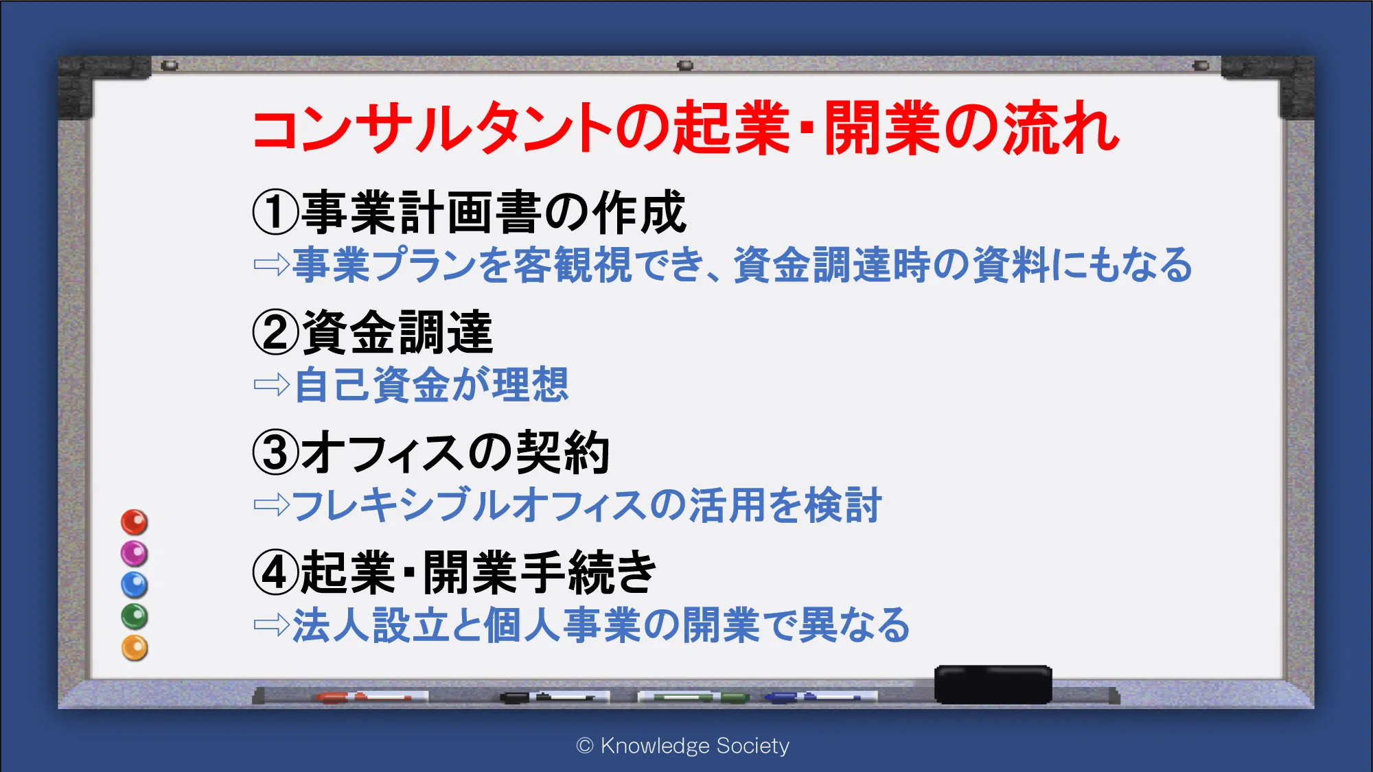 シェアオフィス・バーチャルオフィス@東京都千代田区|ナレッジソサエティ > 起業ノウハウ > コンサルタントとして起業する方法とは│メリットや成功のコツ、開業の流れを解説 > コンサルタントの起業・開業の流れ