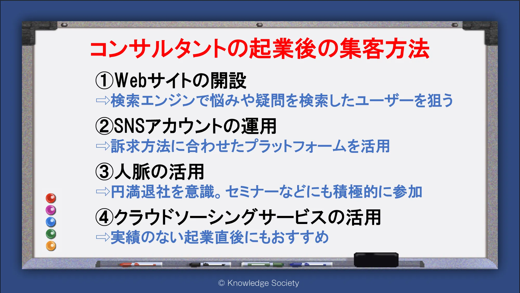 シェアオフィス・バーチャルオフィス@東京都千代田区|ナレッジソサエティ > 起業ノウハウ > コンサルタントとして起業する方法とは│メリットや成功のコツ、開業の流れを解説 > コンサルタントの起業後の集客方法
