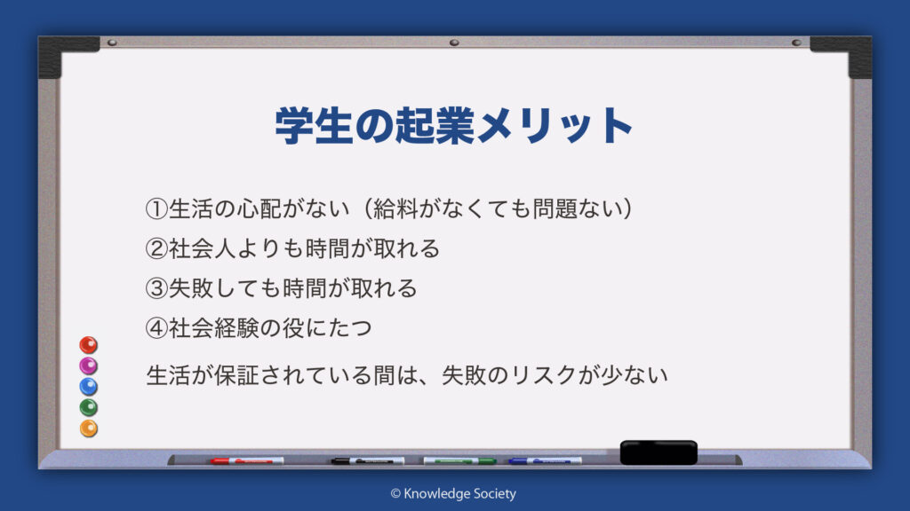 給料(報酬)がなくても生活費の心配がない上、社会人よりも時間が取れる分、たっぷり自分のビジネスに時間をかけられます。失敗したり、途中で計画が頓挫しても取り組んだこと自体が資産となり、社会に出るときに役立つ経験となるでしょう。