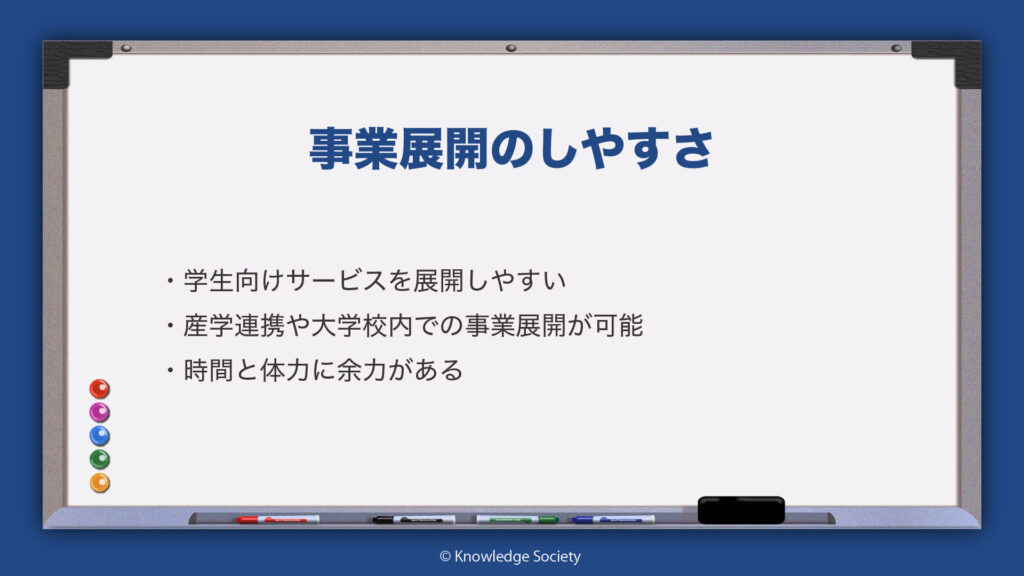 更に、万が一事業に失敗しても再起業が十分に可能な年齢であり、大学卒業後は新卒としての就職ができる点もリスクを抑えて起業に挑戦できる要因となります。