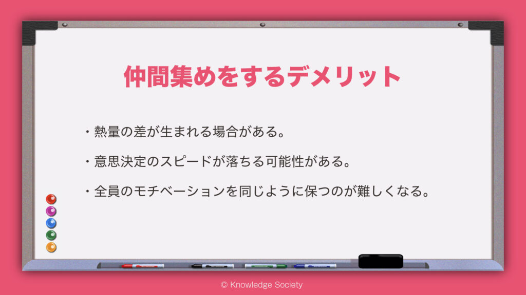 また、そのように仲間のモチベーションを保ち続けるためにマネージメントをし続けるのはとてもエネルギーが必要で、かえって効率が悪くなることもあり得ます。結果として、1人で黙々と作業をこなしていたほうが効率がよかった、ということが起こってしまうかもしれません。
