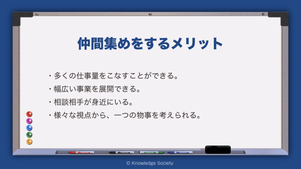 まず上げられるメリットとしては、同じ時間でできる作業量が仲間を募ったほうが向上するということです。仲間を集めて5人で起業した場合には、単純計算をすると仲間を集めて起業した場合のほうが、5倍の仕事量をこなすことができるようになります。上手くチームをまとめ、効率的に作業し続けることができるのであれば、1人で起業した場合に比べて、圧倒的にスピード感が上がります。