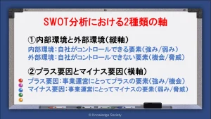 SWOT分析のもう1つの軸が「プラスの要因かマイナスの要因か」です。上記の表に当てはめた場合、横軸に該当します。