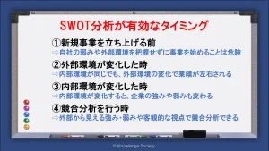 経営資源の変化や知名度の向上、新しい技術の導入といった内部環境が変化したタイミングも、SWOT分析が有効なタイミングとなります。