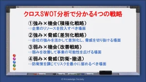 例えば、自社の弱みと外部環境の脅威が重なる状況では、事業の撤退といった保守的な選択肢が生まれます。