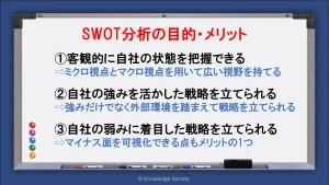 自社の弱み(Weakness)や外部環境の脅威(Threat)といったマイナス面を可視化できる点もSWOT分析の特徴です。