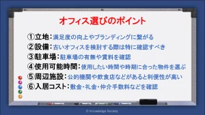 オフィス移転の物件選びで最も重要なポイントが「オフィス移転の目的を達成できるか」です。しかしその他にも、オフィス移転で成功するためのポイントが存在します。