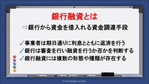 「銀行融資」とは、企業や個人事業主が都市銀行や地方銀行などの銀行から資金を借入れることです。
