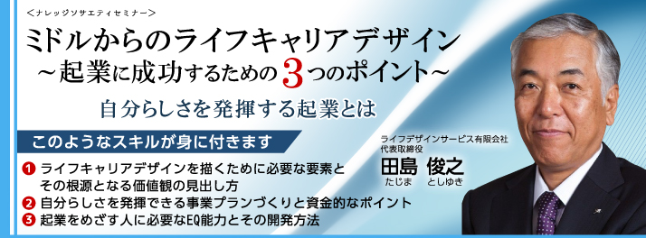 起業家向け会員制シェアオフィス・コワーキングスペース「KSフロア」を運営する株式会社ナレッジソサエティ(本社:東京都千代田区、取締役社長:久田敦史 http://www.k-society.com)は、「起業家が起業家を支援する」というコンセプトのもと、2014年11月13日(木)に「ミドルからのライフキャリアデザイン~起業に成功するための3つのポイント~」セミナーを開催します。