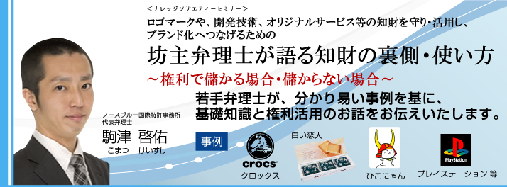 起業家向け会員制シェアオフィス・コワーキングスペース「KSフロア」を運営する株式会社ナレッジソサエティ(本社:東京都千代田区、取締役社長:久田敦史 http://www.k-society.com)は、「起業家が起業家を支援する」というコンセプトのもと、2014年12月5日(金)に「坊主弁理士が語る知財の裏側・使い方」セミナーを開催します。