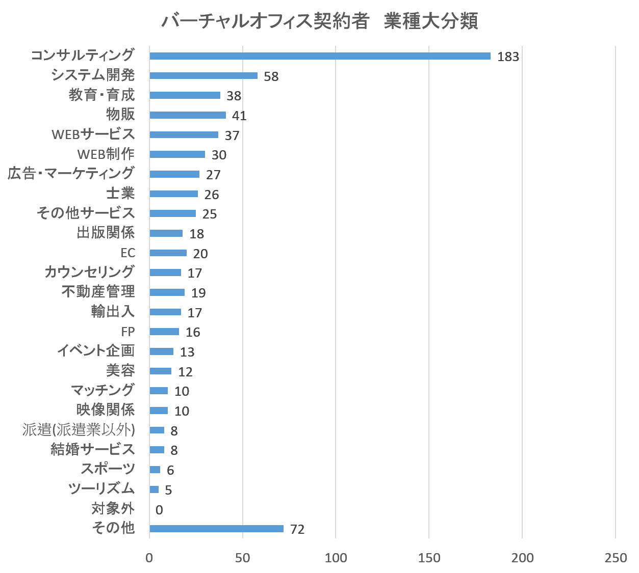 【業種・バーチャルオフィス】コンサルティング:183名、システム開発:58名、教育・育成:38名、物販:41名、WEBサービス:37名、WEB制作:30名、広告・マーケティング:27名、士業:26名、その他サービス:25名、出版関係:18名、不動産管理:19名、カウンセリング:17名、EC:20名、輸出入:17名、FP:16名、美容:12名、イベント企画:13名、マッチング:10名、映像関係:10名、派遣(派遣業以外):8名、結婚サービス:8名、スポーツ:6名、ツーリズム:5名、対象外:0名、その他:72名