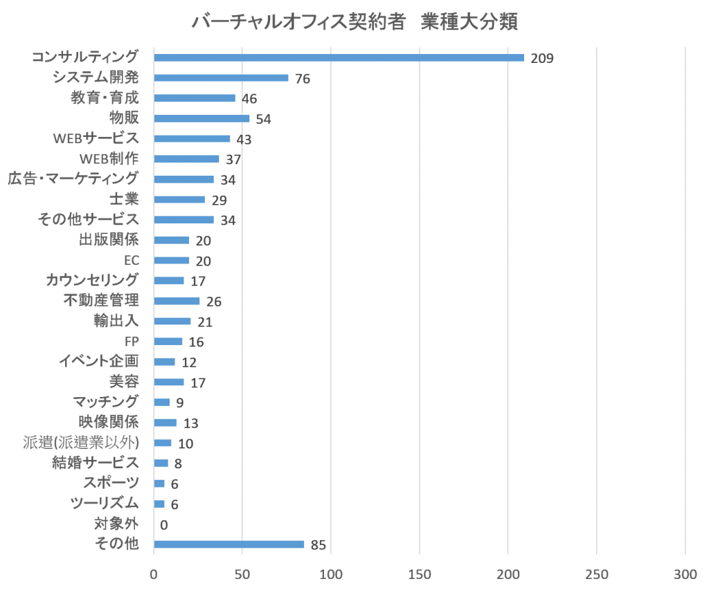 【業種・バーチャルオフィス】コンサルティング:218名、システム開発:82名、教育・育成:46名、物販:54名、WEBサービス:43名、WEB制作:38名、広告・マーケティング:35名、士業:29名、その他サービス:35名、出版関係:19名、不動産管理:27名、カウンセリング:18名、EC:19名、輸出入:21名、FP:16名、美容:16名、イベント企画:11名、マッチング:9名、映像関係:12名、派遣(派遣業以外):9名、結婚サービス:8名、スポーツ:6名、ツーリズム:6名、対象外:0名、その他:84名