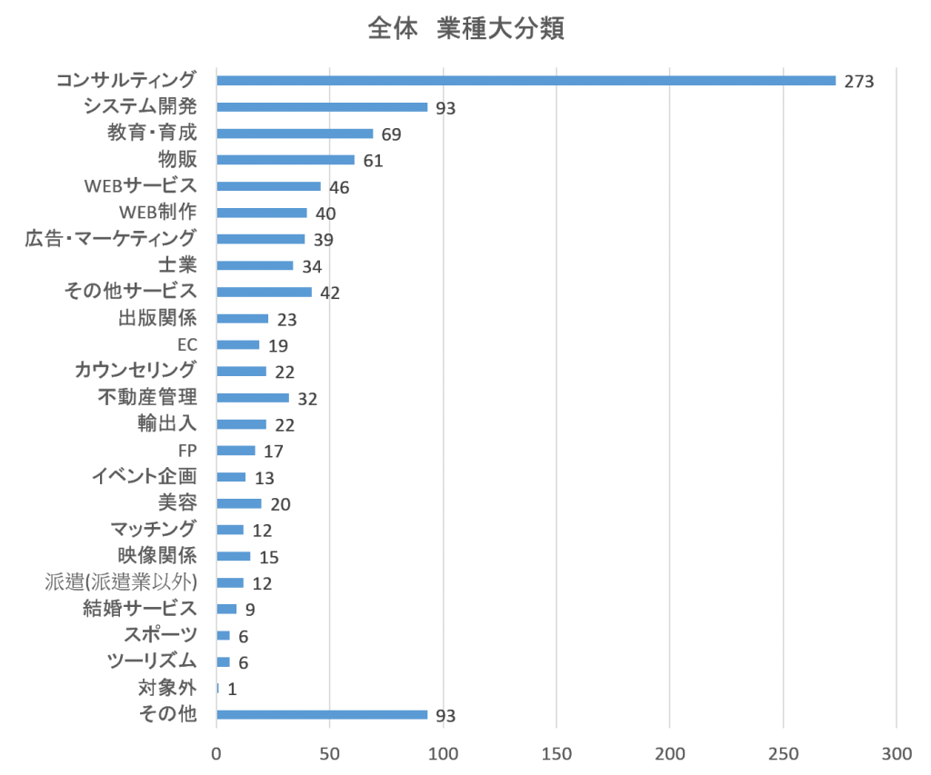 【業種・全体】コンサルティング:273名、システム開発:93名、教育・育成:69名、物販:61名、WEBサービス:46名、WEB制作:40名、広告・マーケティング:39名、士業:34名、その他サービス:42名、出版関係:23名、不動産管理:32名、カウンセリング:22名、EC:19名、輸出入:22名、FP:17名、美容:20名、イベント企画:13名、マッチング:12名、映像関係:15名、派遣(派遣業以外):12名、結婚サービス:9名、スポーツ:6名、ツーリズム:6名、対象外:1名、その他:93名