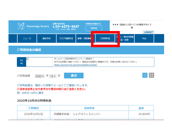 シェアオフィス・バーチャルオフィス@東京都千代田区|ナレッジソサエティ > よくあるご質問 > 支払い・請求 > 請求書の取得方法を教えてください。 > 請求書ダウンロード方法②