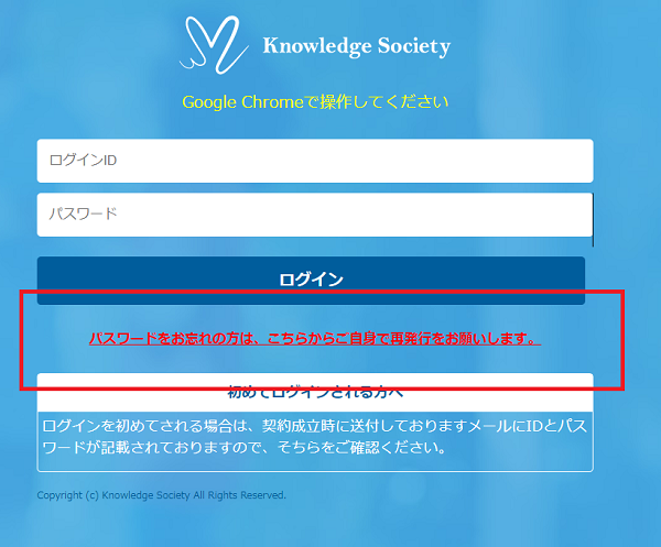 ②「パスワードをお忘れの方は、こちらからご自身で再発行をお願いします。」をクリックします。