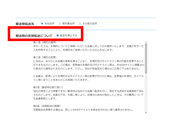 シェアオフィス・バーチャルオフィス@東京都千代田区|ナレッジソサエティ > よくあるご質問 > 変更・解約 > 郵便物の転送を停止したいです。 > 郵便転送先の変更⑦
