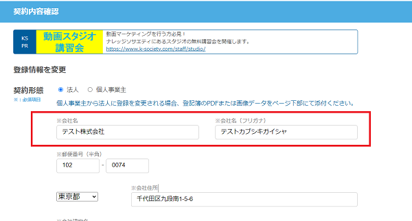 ④法人情報の欄に新しい会社名を入力してください。