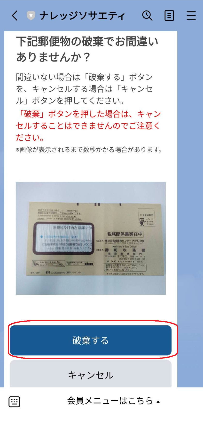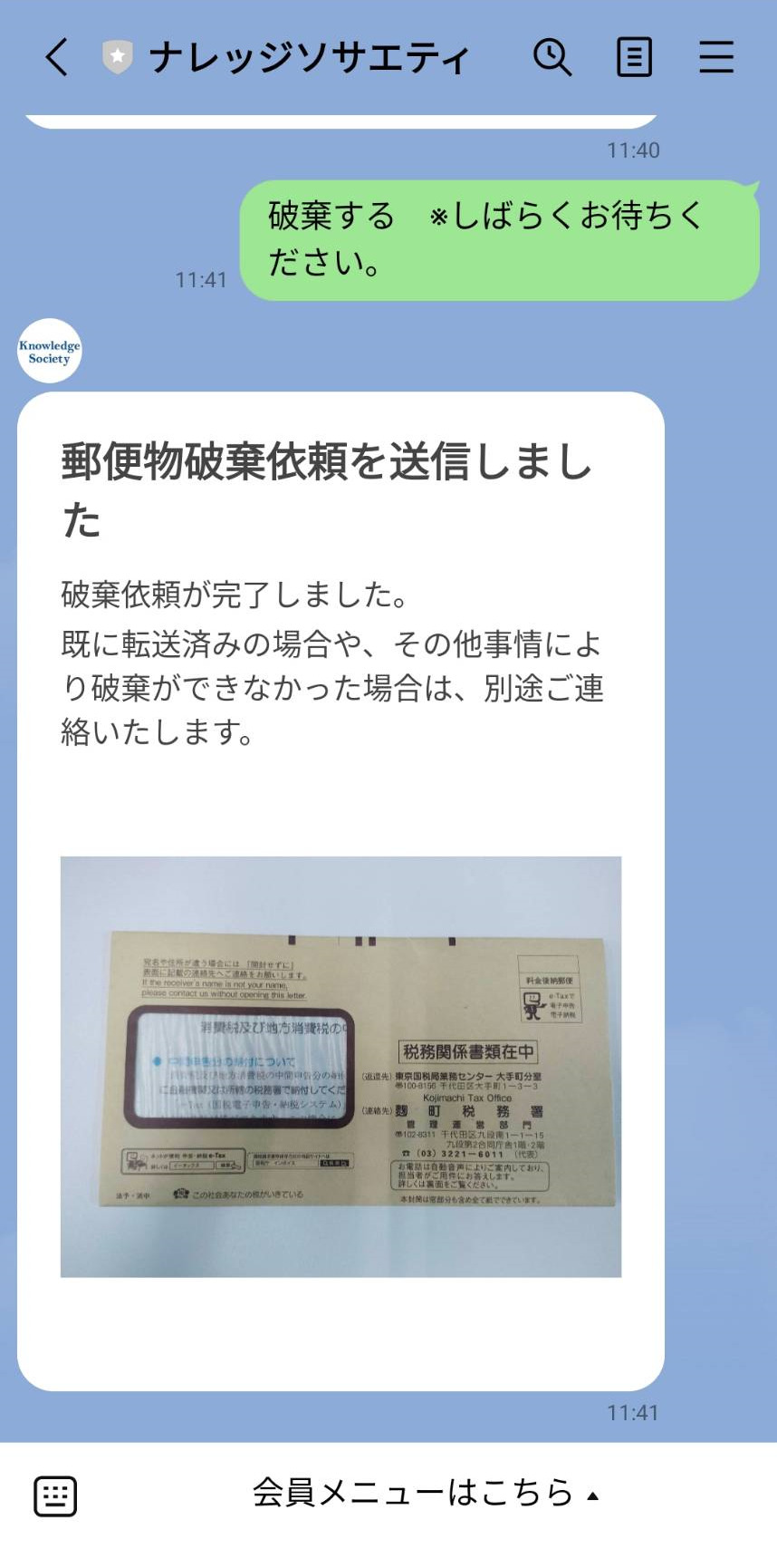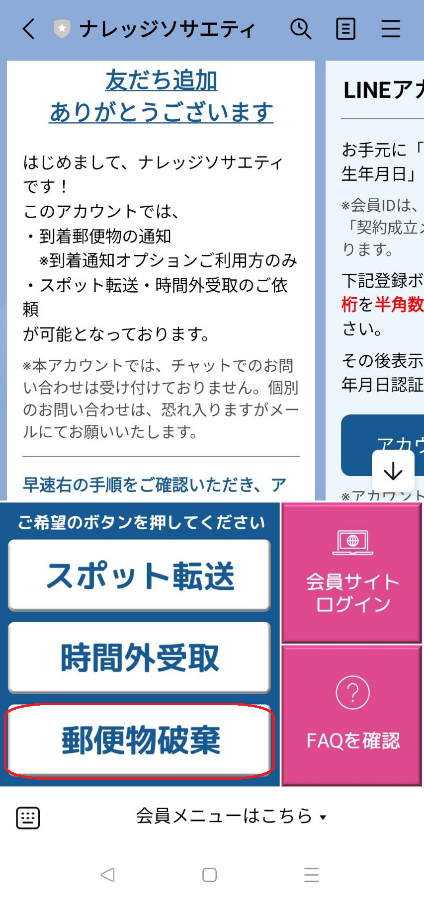 ①LINEのトークルーム内で会員メニューを開き、「郵便物破棄」をクリックします