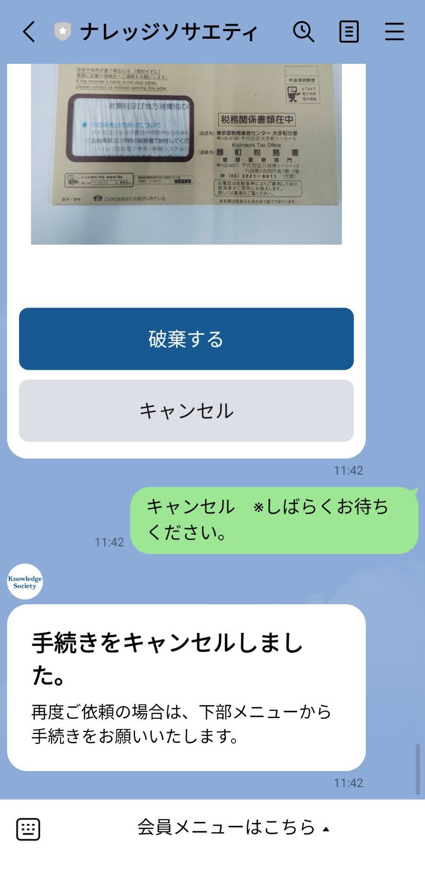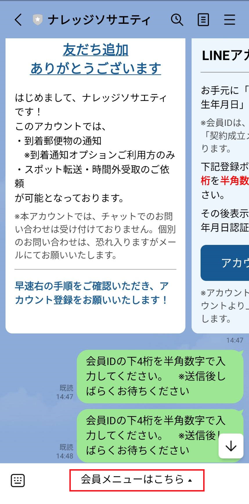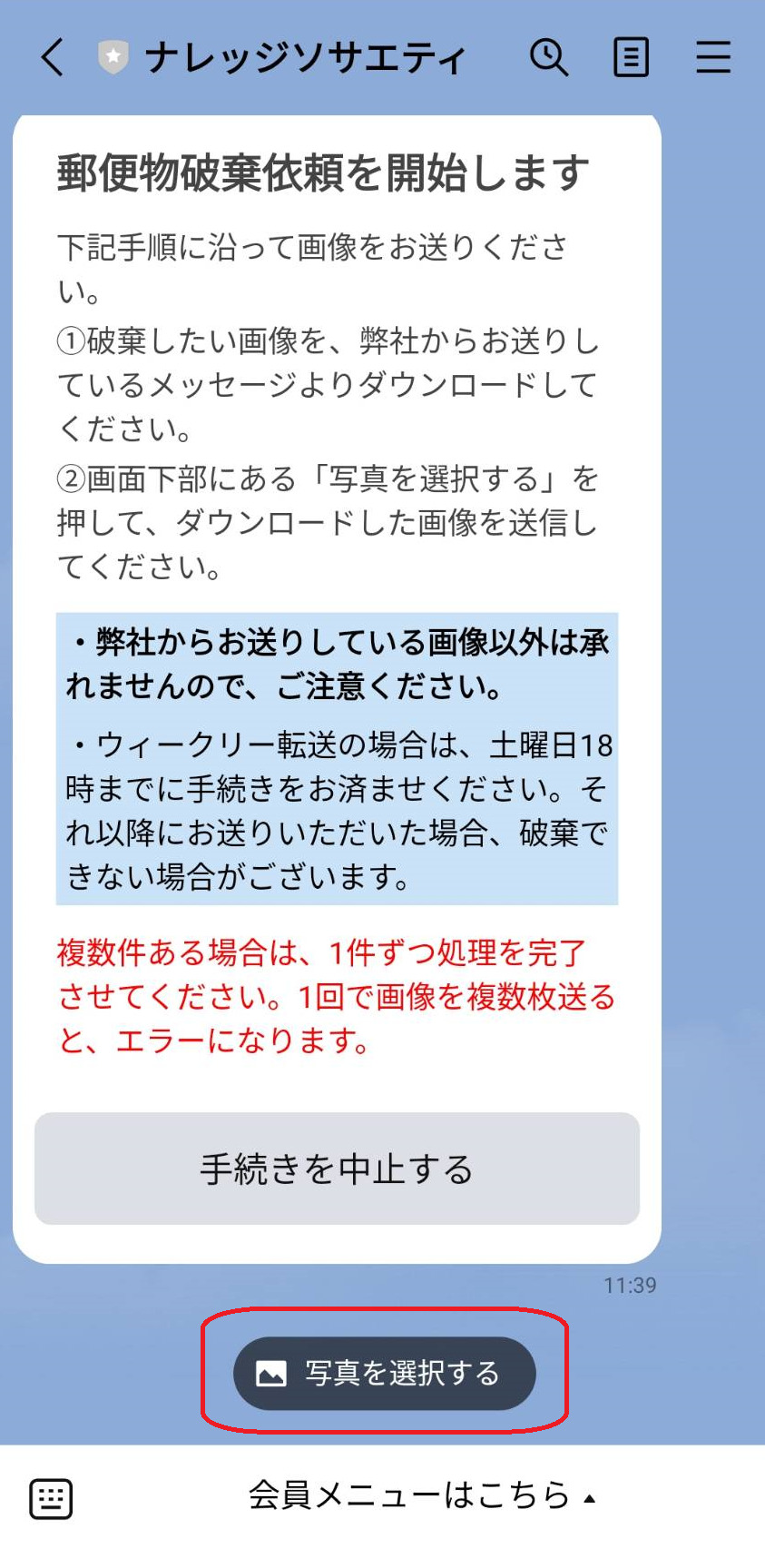 ①LINEのトークルーム内で会員メニューを開き、「郵便物破棄」をクリックします