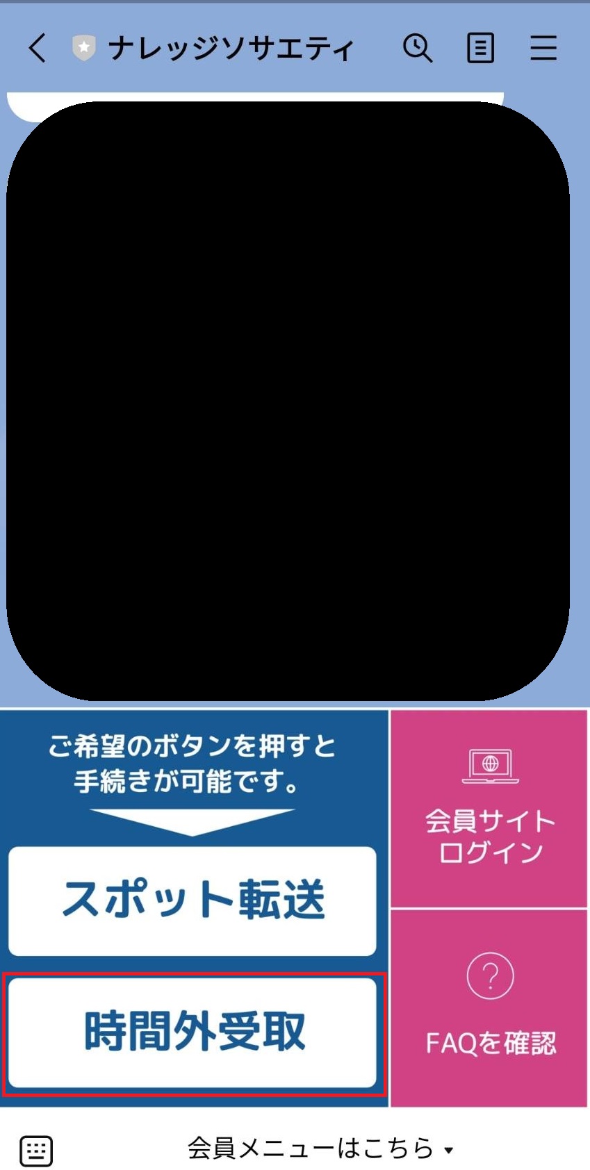 ①LINEのトークルーム内で会員メニューを開き、「時間外受取」をクリックします