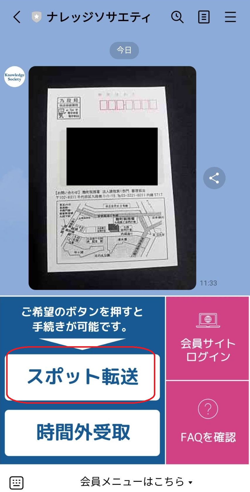 ①LINEのトークルーム内で会員メニューを開き、「スポット転送」をクリックします