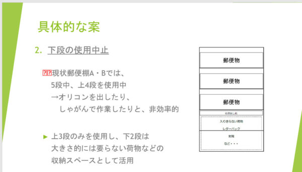 郵便棚と郵便ファイルの具体的な改善案は?