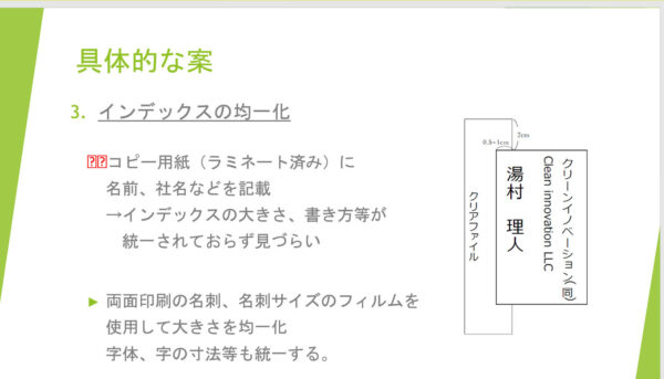 該当する会員さんの保管ファイルを探す際、郵便ファイルのインデックス(タブ)が手作りである点も探しにくさの一因だと感じています。私もそうでしたが、ナレッジソサエティでは個人で契約した後に法人を設立し、法人契約に切り替わる方が多くなっています。そのため、インデックスの作り替えは必須の工程なのですが、郵便ファイルに貼り付けるインデックス(タブ)はラミネート加工した紙に油性ペンで会員名や法人名を手書きするようになっています。