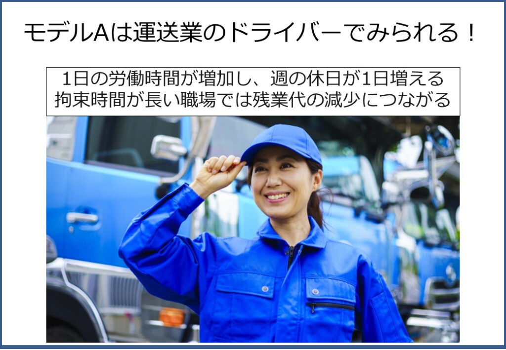 1日の労働時間が増加し、給与水準が減少するモデルAは運送業のドライバーなどでみられる働き方です。運送業のドライバーは1日の拘束時間が長く、結果的に残業ありきの職場になってしまい、人材不足が懸念されています。そのため、変形労働時間制を採用した週休3日制を導入することで、こうした人材不足を解消しようと試みている企業もあります。ただし、日常的に拘束時間が8時間を超過している場合、1日の所定労働時間の増加と勤務日数の減少により残業代の総額が少なくなることも指摘されています。