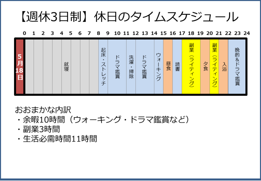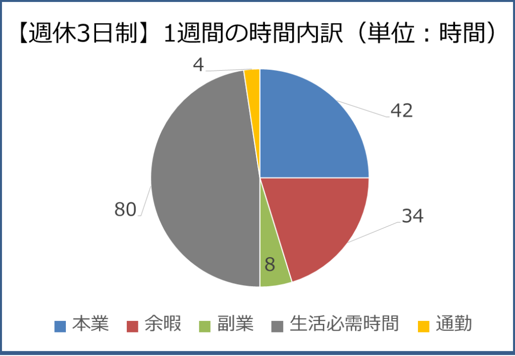 平日は拘束時間が長いため副業に時間を充てることは難しかったですが、休日に関しては3日間休みがあると思うと、少なくとも1日は副業をメインに過ごせる日が生まれると思います。なお、1週間の時間をトータルで考えると、残業時間が3時間減って副業に充てる時間が2時間増えているので、週休3日制になると本業で稼働する時間の一部が副業の稼働時間になるということも言えると思います。今回は4連勤後にもう1日追加で勤務することになったため、実際に3連休となった場合は休日の副業時間がもう少し増えるのではないかと感じています。