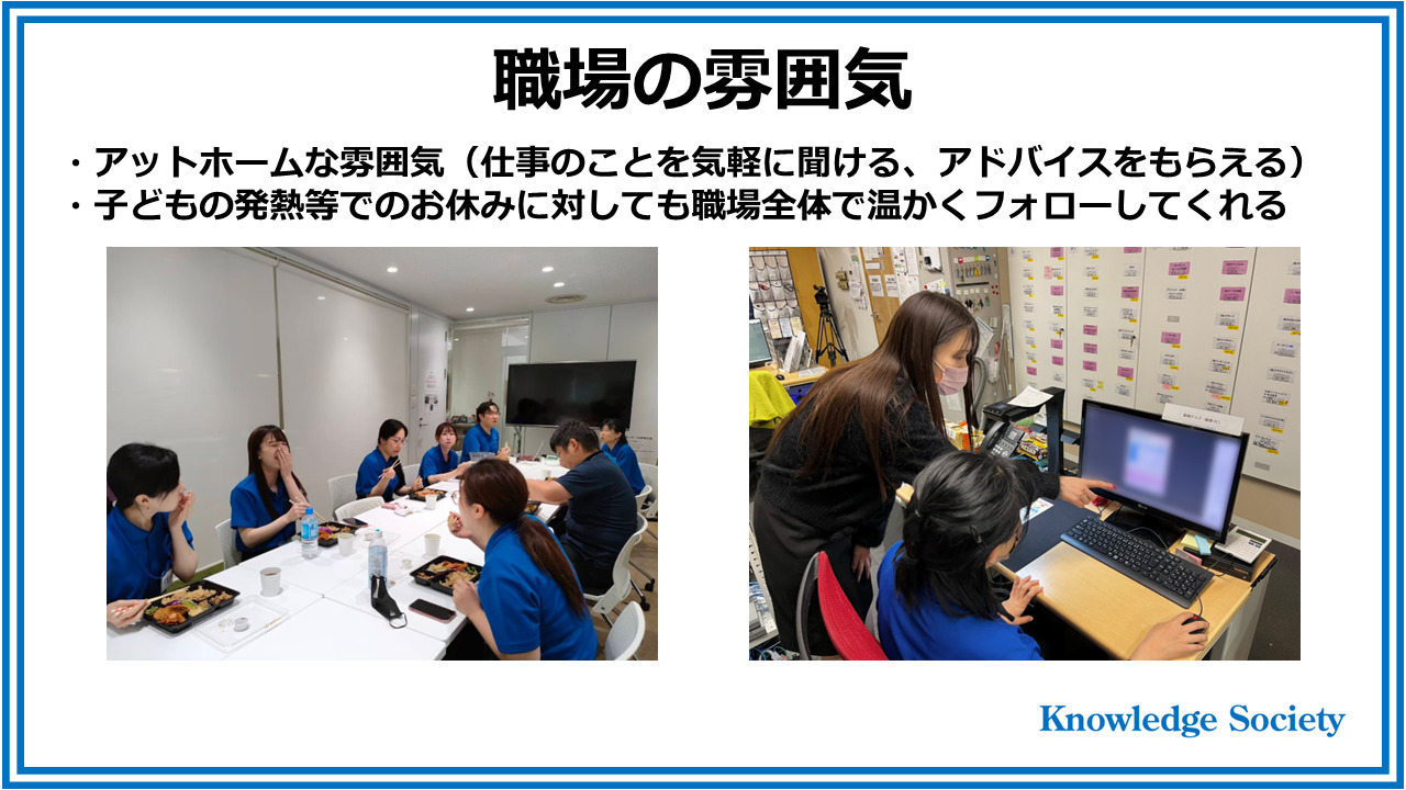 また、子どもの体調不良等で突然お休みをいただくこともあり申し訳ないなと思っているのですが、職場全体で温かくフォローしてくださるので感謝しています。申し訳ない気持ちはありつつも、良い意味でお休みをいただくことに気を遣いすぎない雰囲気が良い職場だなと思います。