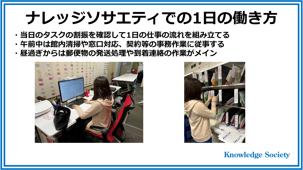 職場体験ではスタッフ間の距離が近く、コミュニケーションがとりやすく、とても雰囲気が良かったので、ナレッジソサエティで働きたいなという思いをもって帰ったことを覚えています。