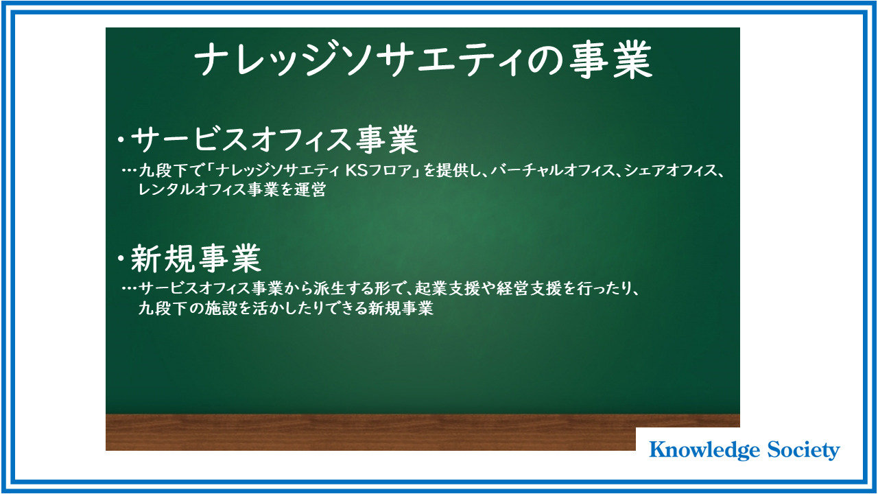 日本に起業家というチャレンジャーを増やすためには、経済的な理由、心理的な理由で諦めてしまうということをなくす必要があります。現在のナレッジソサエティは、バーチャルオフィスやシェアオフィス、レンタルオフィスといった各種サービスを提供することで、起業に立ちはだかる経済的な障壁を取り除こうとしています。また、提供するオフィスビルのグレードや入会時の対面審査などにこだわり、こうしたサービスを利用することに対する心理的な障壁も取り除こうとしています。今後も、常に起業家というチャレンジャーを増やす、そして起業家を幸せにするという視点で、新たなサービスの提供も視野に入れて行動していきます。
