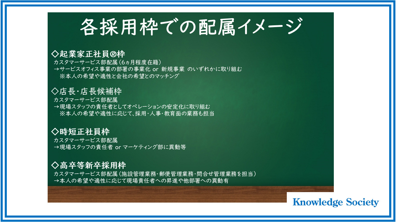 当初は当社で働きながら、自分自身で起業し卒業していくという制度としてスタートしましたが、週休3日制や週休4日制といった強みを強調するため、一時期は募集対象を試験勉強や競技活動にまで拡大しました。既に起業している人が入社しやすいように時短の週休3日制、週休4日制といった形の制度を導入しました。しかしながら、ある時期から当社がイメージしていた採用したい人財と、実際に選考の問い合わせがある層とのギャップが大きくなりました。また、当社がその間に既存スタッフを中心に、社内の定型業務の効率化、標準化をある程度進めていくことができるようになったことから、起業家正社員🄬の採用枠で入社される方に、継続的にオフィスサービス事業の定型業務を担ってもらう必要がなくなりました。