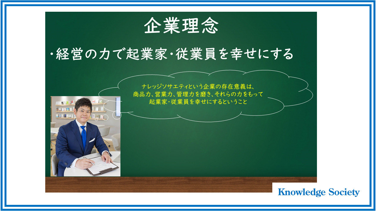 ナレッジソサエティという企業の存在意義は、商品力、営業力、管理力を磨き、それらの力をもって起業家・従業員を幸せにするということにあると位置づけています。