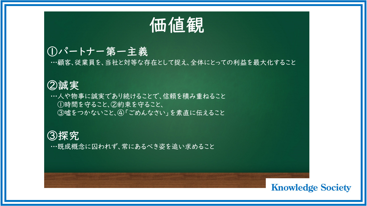 企業経営を行う上で、ナレッジソサエティが大切にする価値観は次の3つです。この価値観は当社で働くスタッフとも共有できていなければならないものです。