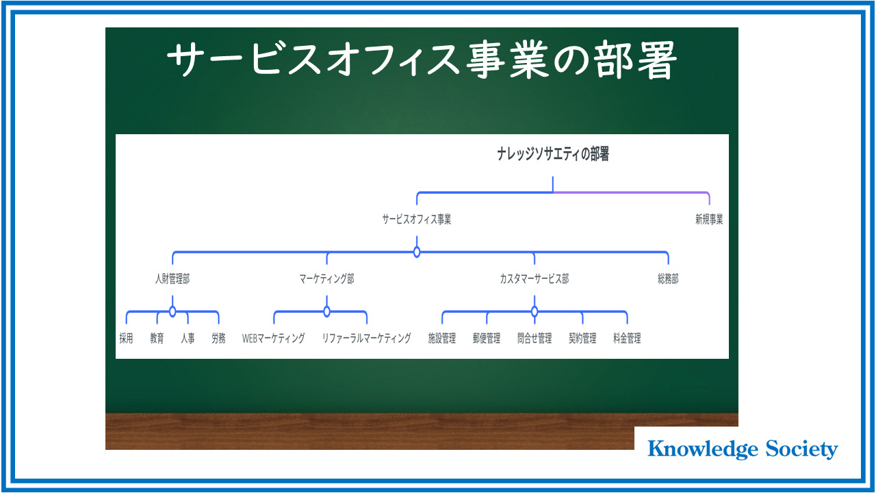 ナレッジソサエティのメインとなる事業はサービスオフィス事業です。当社は、東京都千代田区の九段下で「ナレッジソサエティ KSフロア」を提供し、バーチャルオフィス、シェアオフィス、レンタルオフィス事業を行っています。サービスオフィス事業を提供するための部署は大きく4つに分類されます。
