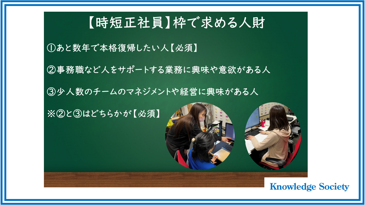 まずは、現段階では育児等、家庭との両立でセーブして働くフェーズだが、数年後にはバリバリ働きたいと考えている人を求めます。社会全体として子育てに対する理解は広がりつつありますが、働き方の多様性として時短の勤務が出来なかったり、制度はあるが職場の理解がなかったりで現職の継続が難しいという方や、子育てのために一度退職したが、将来的なフルタイムでの社会復帰を念頭に入れたうえで働き始めたいといった方に最適な求人かなと思います。