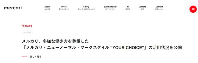 「新たな価値を生みだす世界的なマーケットプレイスを創る」。これは私たちが実現したいミッションです。メルカリは、このミッションを実現するために、「人」「技術」「グローバル」に投資を続けてきました。なかでも、もっとも大切なことは「人」への投資だと考えています。それは、一人ひとりが成長し、パフォーマンスを最大限発揮できる環境こそ、ミッション実現への近道だと信じているからです。メルカリは、これまでの習慣やルールに縛られない、私たちらしい「働き方」を追求していきます。(WEBから引用) |