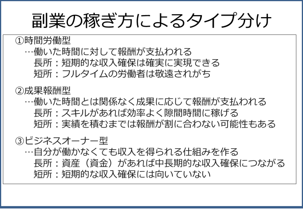 先ほど労働者の目的によって、収入補填型、趣味追求型、スキルアップ追求型、独立志向型の4つのタイプに分類しましたが、ここではお金の稼ぎ方によって3つのタイプに分類したいと思います。