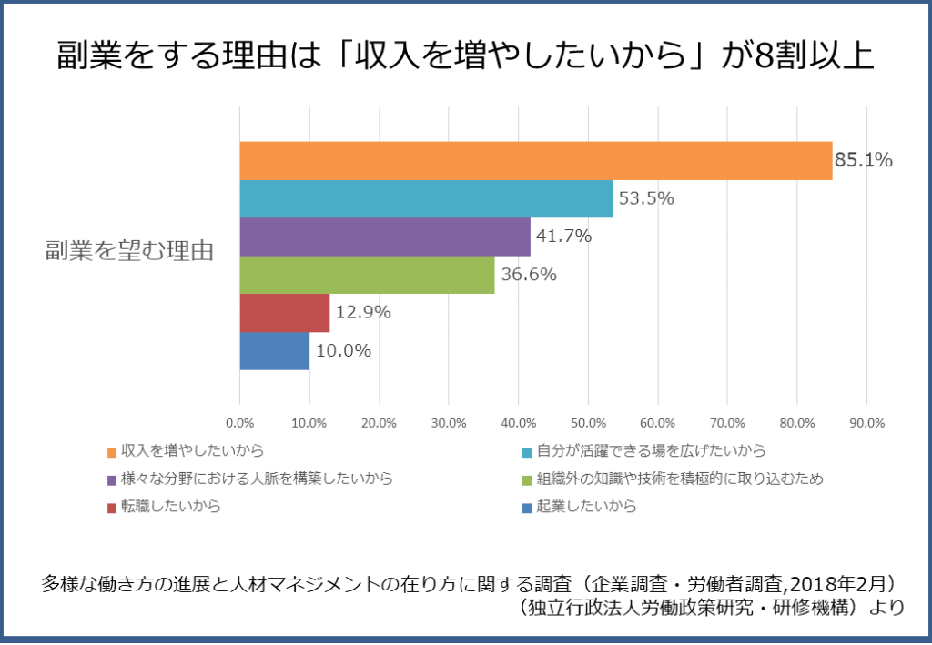副業する目的(複数回答)については同調査で「収入を増やしたいから」という回答が85.1%と高い割合を示していますが、その他の理由でも「自分が活躍できる場を広げたいから」が53.5%、「様々な分野における人脈を構築したいから」が41.7%、「組織外の知識や技術を積極的に取り込むため(オープン・イノベーションを重視)」が36.6%と、収入以外の理由でも副業を検討している人が一定数存在していることがわかります。