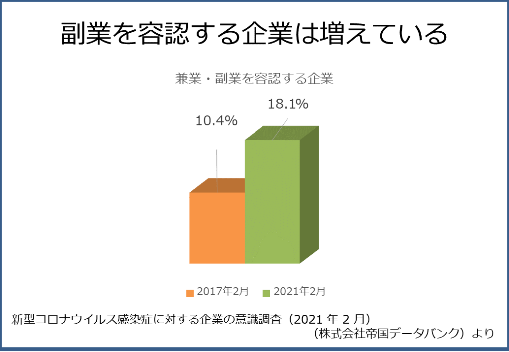 帝国データバンクの調査によると、兼業・副業を認めている企業の割合は「モデル就業規則」から副業禁止規定を削除する以前の2017年2月には10.4%でしたが、2021年2月には18.1%まで増加しており、政府の働きかけが副業・兼業の容認に一定の効果をもたらしている印象を受けます。