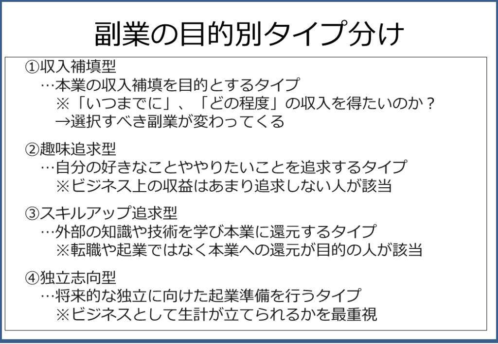 3つ目のタイプは、外部の知識や技術を学び本業に還元するために行うという「スキルアップ追求型」です。社内での昇給や昇進などを目的にしたり、自分自身のスキルアップを図ったりするなど、あくまでも本業に還元する形で副業を行う人をこのタイプに分類したいと思います。