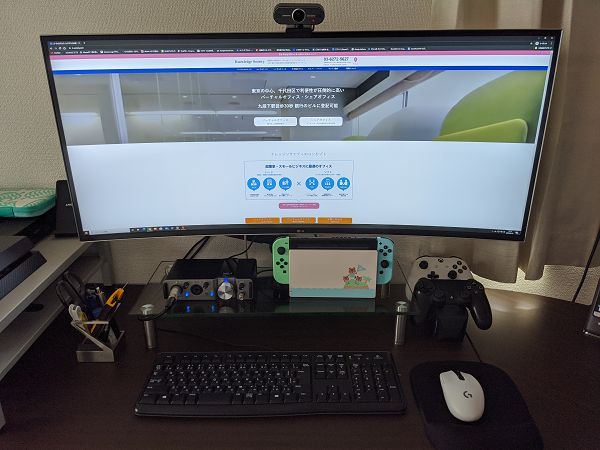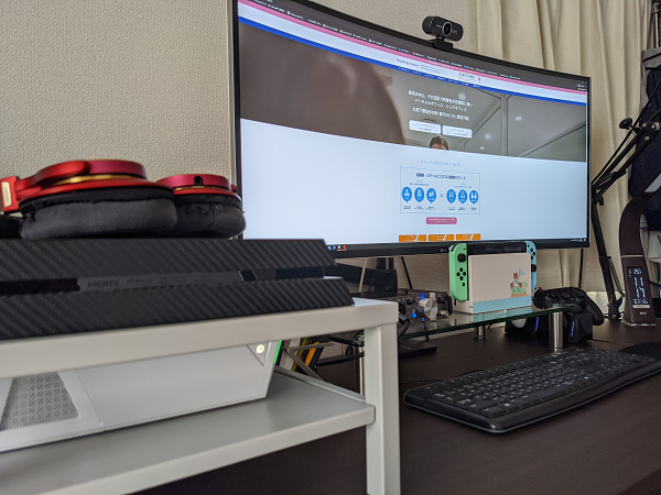 仕事用に用意した環境ではなく日頃のネットサーフィンやゲームをする環境でもあるのでゲーム機などが写っていてすいません。。。ただ、こだわりの湾曲ディスプレイのおかげで画面が大きいので仕事を進めやすかったです。