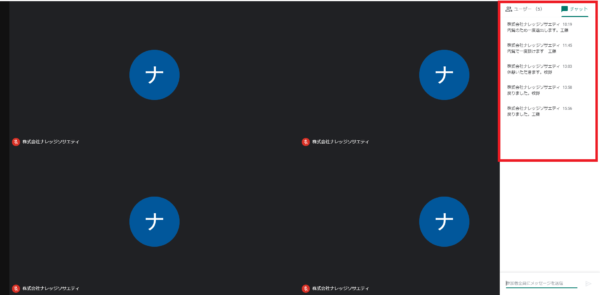 チャット機能(赤枠)もついているので一時的に離席をする場合などに伝言を残すことができます。