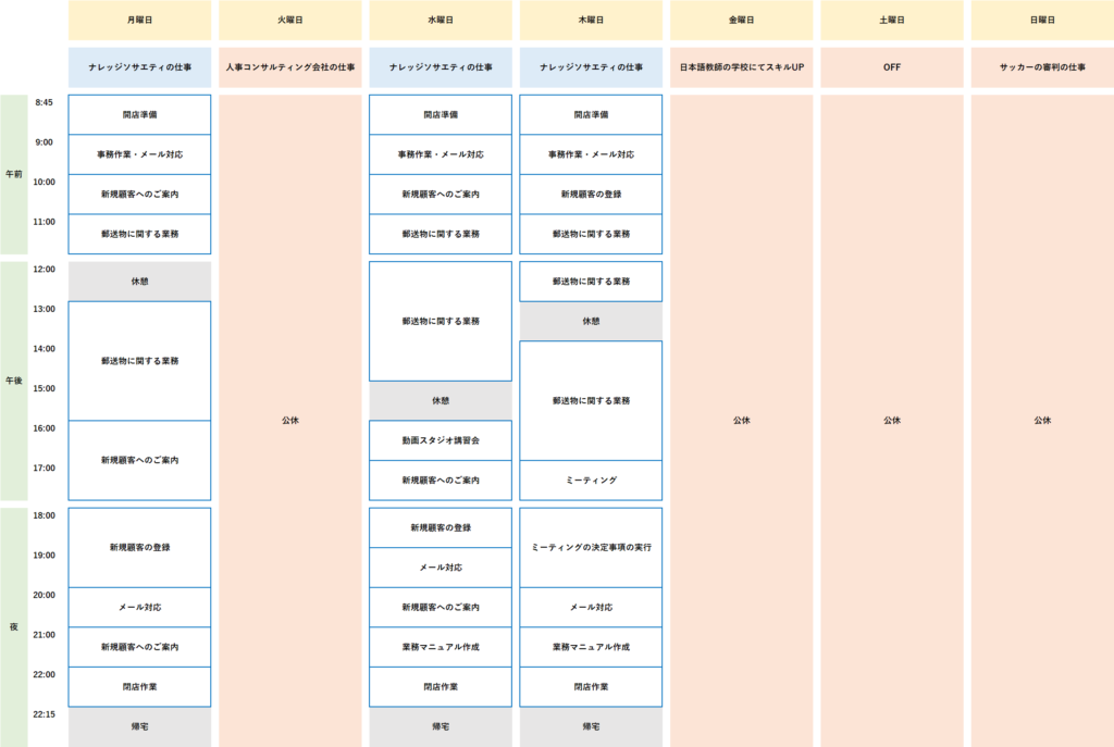 大学卒業後、ナレッジソサエティに就職し、研修期間を経て週休4日制に移行。